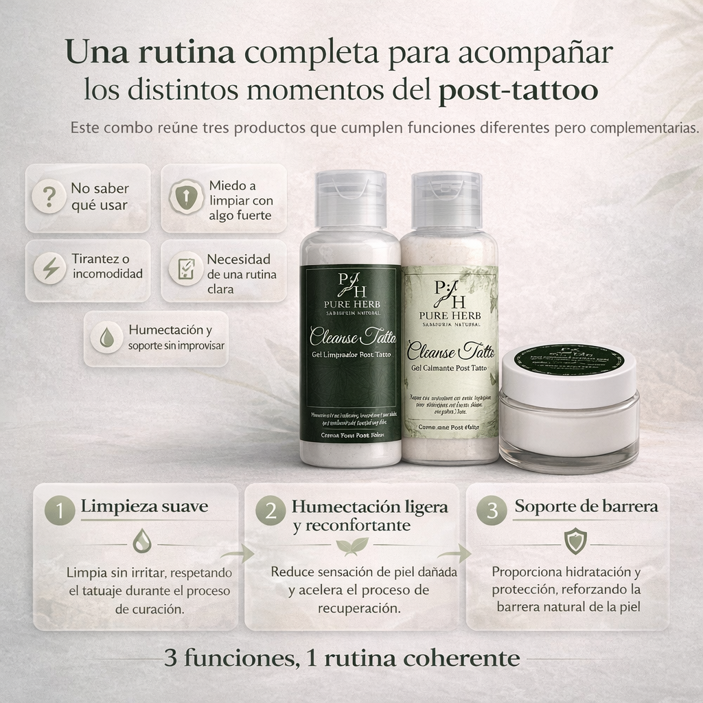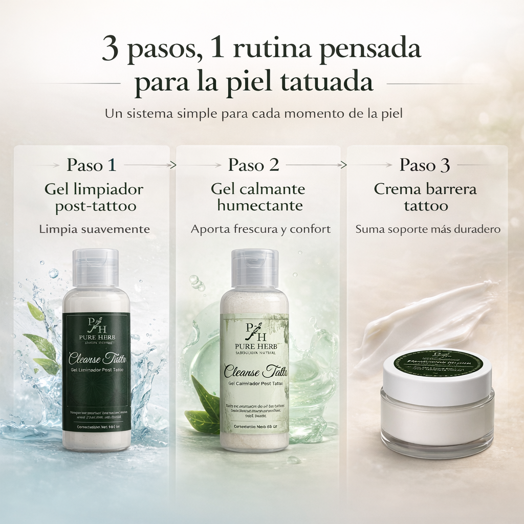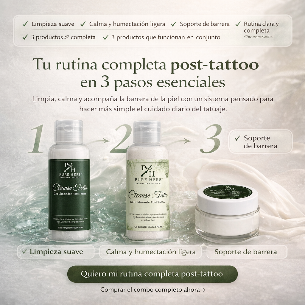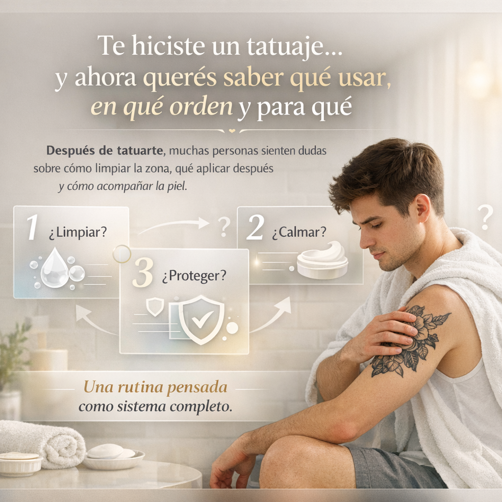 Después de tatuarte, muchas personas sienten lo mismo: dudas sobre cómo limpiar la zona, qué aplicar después y cómo acompañar la piel durante los días en que se siente más sensible, tirante o seca. Por eso, más que productos sueltos, esta rutina fue pensada como un sistema completo que organiza el cuidado del tatuaje de forma simple