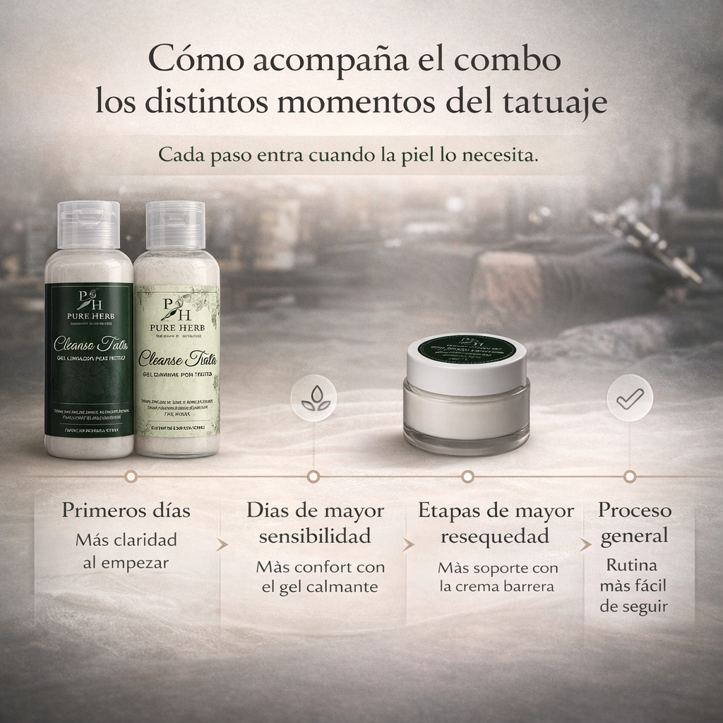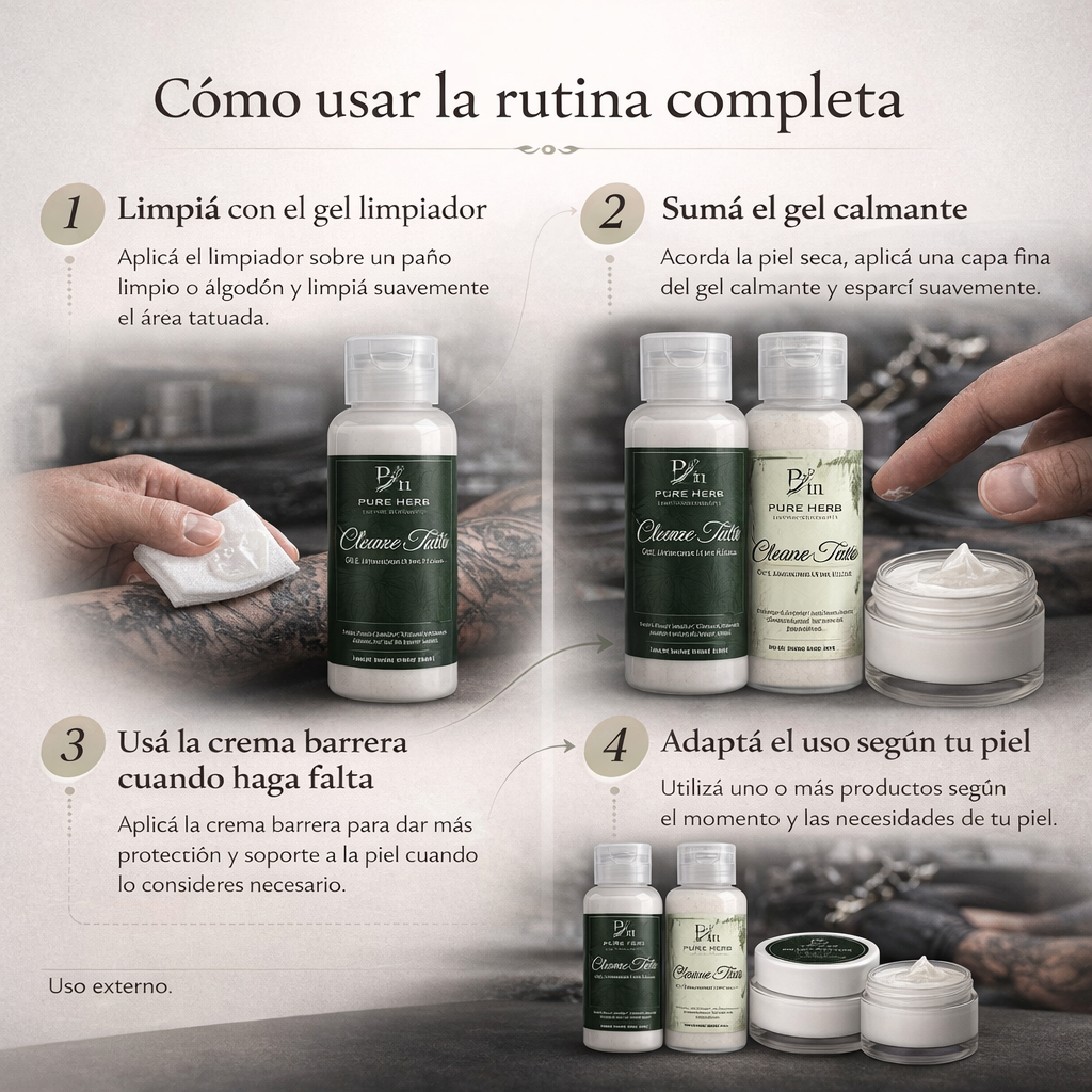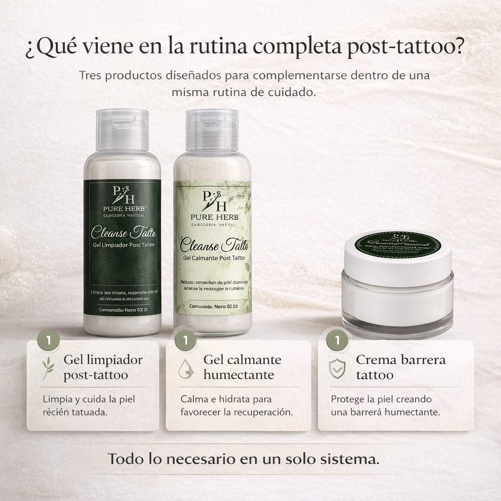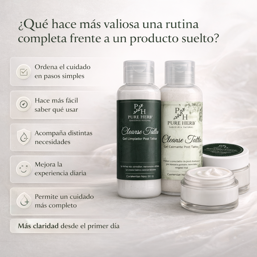 Después de tatuarte, muchas personas sienten lo mismo: dudas sobre cómo limpiar la zona, qué aplicar después y cómo acompañar la piel durante los días en que se siente más sensible, tirante o seca. Por eso, más que productos sueltos, esta rutina fue pensada como un sistema completo que organiza el cuidado del tatuaje de forma simple