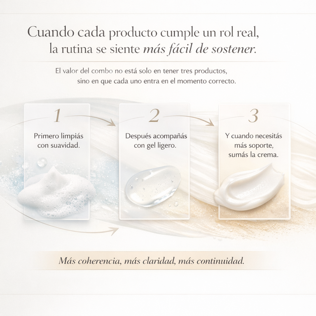 El valor del combo no está solo en tener tres productos, sino en que cada uno entra en el momento correcto. Primero limpiás con suavidad. Después acompañás la piel con un gel ligero. Y cuando necesitás más soporte, sumás la crema barrera. Así, la rutina se vuelve más coherente, más clara y mucho más simple de seguir