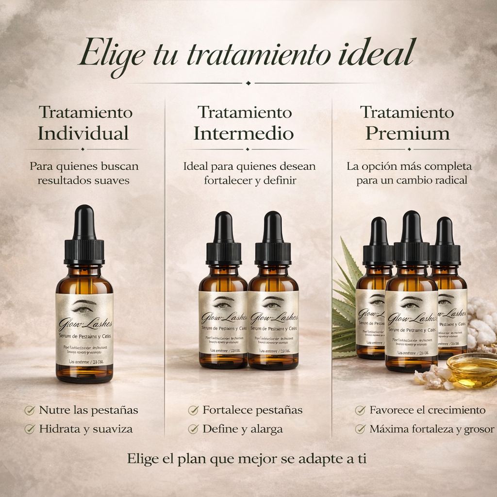 Tratamiento Premium (3x1): El plan más completo para aquellas que buscan resultados notables y duraderos. Obtén tres unidades de Glow Lashes a un precio exclusivo. Ideal para quienes buscan no solo el crecimiento, sino un cambio radical en la densidad y longitud de las pestañas y cejas